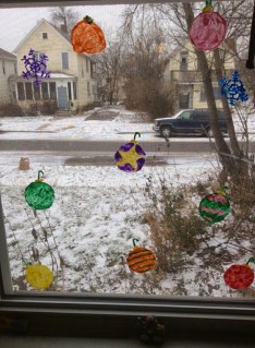 The idea of window clings came across my facebook feed. My thought was I would be able to make some and maybe my son might be able to help. Well, at 19 months you can guess the kind of help I got. While I did most of the work, he did put forth a few suggestions like which colors to use or to make a certain shape. Maybe next year he will help decorate them more. Either way, we had lots of fun and are enjoying the fun colors they bring into the day.