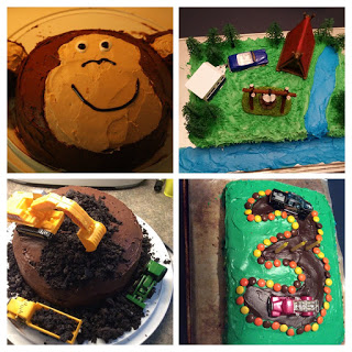 For my oldest, I have done themed cakes since his first birthday. His first one was a monkey because his room was jungle themed. Since then, I\’ve gone off what he likes. The second cake was a construction site with diggers and dump trucks because he liked all things vehicles. Still liking vehicles for his third birthday, even hinted at two trucks he wish he could have for birthday presents, I made him a road cake with those trucks on it. This year, fourth birthday, I asked him totally for his input. He said he wanted a camping one. So I asked what needed to be on it and he gave me a short list…a camper and vehicle, a fire, a tent. I went with it. This year he got a camping cake.