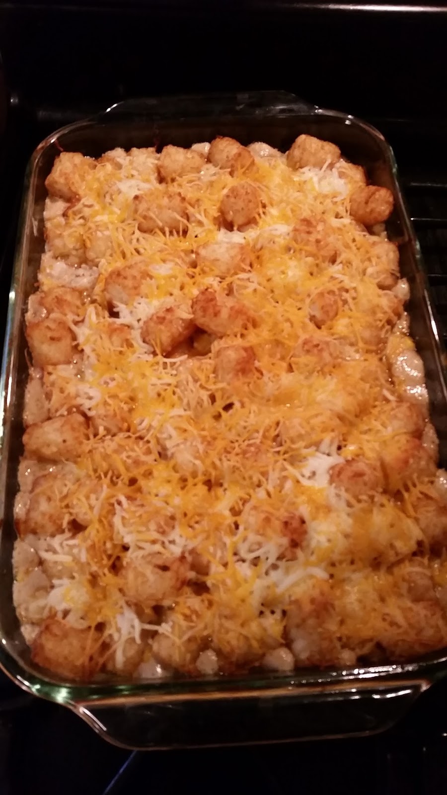 - Bake uncovered for 25-30 minutes or until cheese is bubbly and tater tots are thoroughly cooked.
