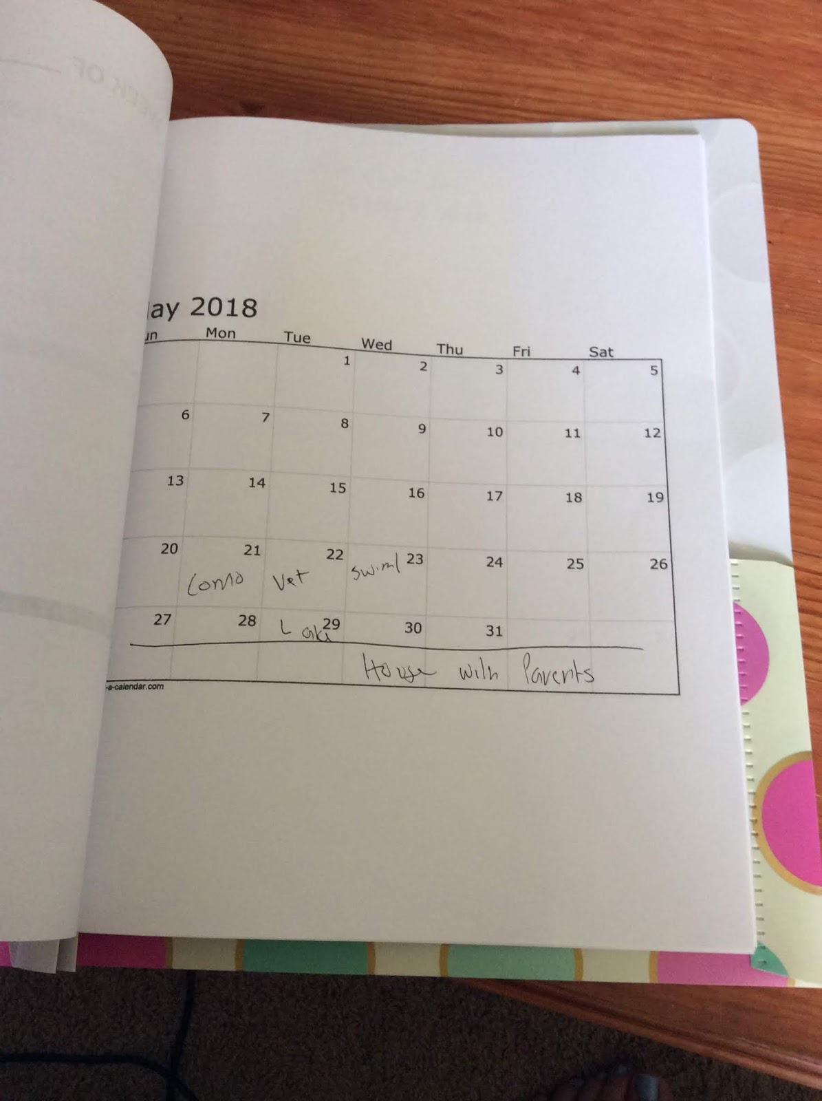 I couldn\’t find pre-made calendar and schedule set up that I like or a template or something that wasn\’t bulky and expensive with too much other filler I knew I wouldn\’t use. So I ended up created my own. I took and printed out a blank 2018 calendar for the rest of the months of the year. For my schedule, I took a word template and changed it to fit what I was looking for. Then I bought a report cover with pockets inside and place all the papers in it. It sits on my coffee table and I am okay with that.