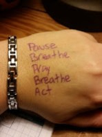 This was what I needed to write on my hand a week and half ago. It was after BSF on Thursday where we talked about pause and pray. I added in the other parts because it was something that I needed. I forget at times to put God first, throughout the day. I take time in the morning to pray and to do devotions, I take time sometime during the day to think about the things I am grateful (which lately is as I fall asleep), and yet I sometimes forget to pause, forget to breathe, forget to pray.
