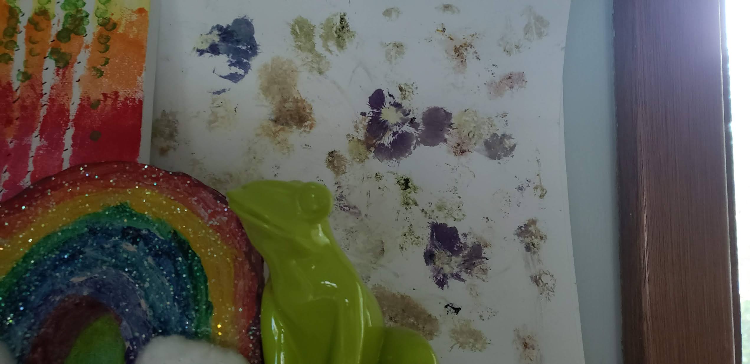 {The photo is what the hammered flowers turned out to look like on paper. Next to it are a few other creative works. T made a clay rainbow in art class, I made a birch forest on canvas.}