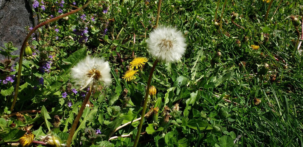 The other day when we got out of the car, and the sea of yellow was beginning to turn to white. My youngest (6 1/2) noticed a few full, fluffy dandelions and went right up to one, picked it and with the biggest smile said “yeah, wishing dandelions!”
